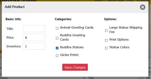 Click the green New Product button for the correct Category to add a new product. You will get a pop-up screen asking for the Title of the product, the Price, and the number of them you have in Inventory.