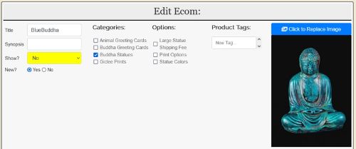 You should make sure you set "Show?" to Yes, or the product will not display on the website. Also set "New?" to No if you are in the process of initially building your website. If your site has been up for a while and you have customers that come to look now and then, leave New to Yes, as it will add a big, blue "New!" graphic over your product image.