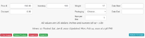 The next section of the Edit page is managing the Price and the Inventory. When customers buy your products, the inventory will go down, eventually to zero (0). When that happens, the product will no longer be available for purchase. So, if you sell a product that you create on the fly or are always making, you should set the inventory to a high number so you don't have to worry about the inventory on the site.